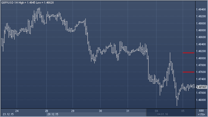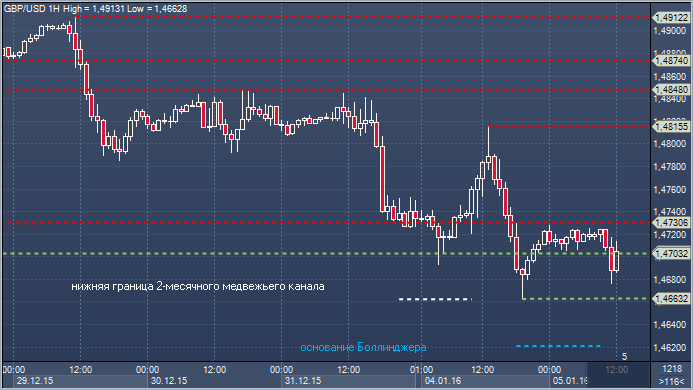 Фунт/доллар. Технический взгляд Сопротивление 4: $1.4874 - часовое сопротивление 29 декабря Сопротивление 3: $1.4849 - максимум 30 декабря Сопротивление 2: $1.4815 - максимум 4 января Сопротивление 1: $1.4730 - часовое сопротивление 4 января Цена: $1.4705 Поддержка 1: $1.4703 - часовая поддержка 5 января Поддержка 2: $1.4663 - минимум 4 января Поддержка 3: $1.4621 — основание Боллинджера Поддержка 4: $1.4564 — минимум 2015 от 13 апреля