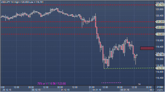 Доллар/иена. Технический взгляд Сопротивление 4: Y120.45 - внутридневной максимум Сопротивление 3: Y120.02/06 — минимумы 31 дек 25 декабря, теперь сопротивление Сопротивление 2: Y119.70/80 - внутридневной разворотный уровень, часовой максимум Сопротивление 1: Y119.30/40 - часовое сопротивление Цена: Y119.14 Поддержка 1: Y118.72 - минимум 4 января Поддержка 2: Y118.24 - 76,4% Фибоначчи от Y116.56-Y123.66 Поддержка 3: Y118.10 — минимум 15 октября Поддержка 4: Y117.76 — 2%-ная волатильность