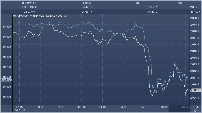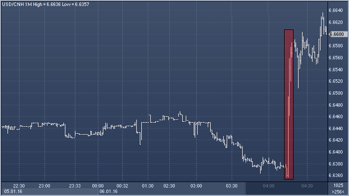 Несколько минут назад в рамках ежедневного фиксинга Банк Китая понизил курс юаня на 0.22% (прим. ProFinance.ru: рекордная с 3 ноября величина) и теперь «официальный» материковый доллар/юань стоит 6.5314. Отметим, что в рамках торгов курс этой пары не может отклоняться от фиксинга более чем на 2% в любую сторону. В результате спред между материковым и «оффшорным» юанем, который используется в качестве индикатора потенциала будущей девальвации, достиг рекордных 1429 пипсов. Как это обычно бывает, девальвация юаня привела к резкому росту антирисковых настроений и иены, а также снижению «валют роста», вроде аусси и киви и фьючерсов на фондовые индексы.