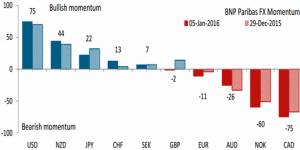 Валютные стратеги BNP Paribas обновили еженедельно публикуемую оценку текущей ситуации на валютном рынке, сгенерированную системой FX Momentum. Как следует из ее названия, система оценивает силу валютных трендов, исходя из текущей динамики валютных курсов, ставок и поведения фондового рынка. В приведенной ниже таблице указаны текущие оценки силы тренда основных валют по шкале от -100 (сильнейший медвежий моментум) до +100 (сильнейший бычий моментум).