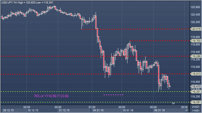Доллар/иена. Технический взгляд Сопротивление 4: Y120.01 - минимум 31 декабря, теперь сопротивление Сопротивление 3: Y119.70 - максимум 5 января Сопротивление 2: Y119.28 - часовое сопротивление 5 января Сопротивление 1: Y118.81 - часовое сопротивление 6 января Цена: Y118.47 Поддержка 1: Y118.33 - часовая поддержка 6 января Поддержка 2: Y118.05 - месячный минимум 15 октября Поддержка 3: Y115.90 - месячный минимум 24 августа Поддержка 4: Y115.45 - минимум 17 ноября 2014
