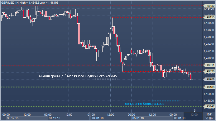 Фунт/доллар. Технический взгляд Сопротивление 4: $1.4849 - максимум 30 декабря Сопротивление 3: $1.4815 - максимум 4 января Сопротивление 2: $1.4730 - часовое сопротивление 4 января Сопротивление 1: $1.4681 - часовое сопротивление 6 января Цена: $1.4640 Поддержка 1: $1.4636 - минимум 5 января Поддержка 2: $1.4580 — основание Боллинджера Поддержка 3: $1.4564 — минимум 2015 от 13 апреля Поддержка 4: $1.4507 - минимум 11 июня 2010