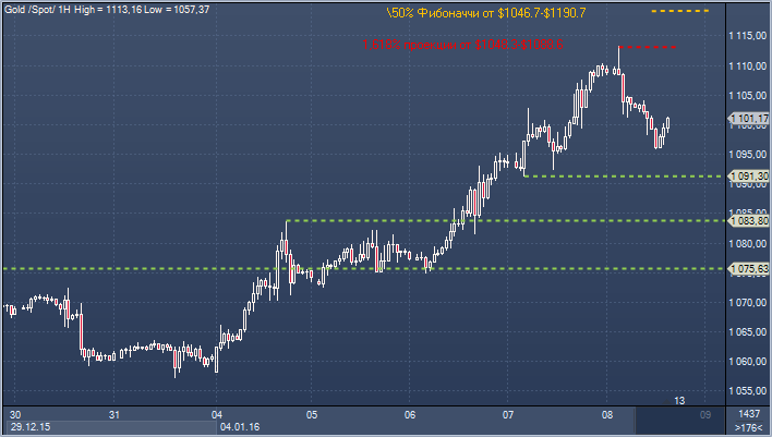 Комментарий:на этой неделе мы, наконец, увидели прорыв из диапазона, когда пробили вверх уровень $1087.6. Это ознаменовало начало коррекции затяжного падения $1190.7-$1046.7, которое наблюдалось последние 3 месяца 2015 года. Мы уже достигли первого уровня коррекции в 38,2% Фибо на $1101.7. Это делает область $1113.5-$1118.7 следующей целью роста. Некоторая перепроданность наблюдается на часовых осцилляторах в настоящее время. Необходимо ее устранить. Пока мы остаемся выше уровня $1091.6, будет сохраняться возможность предотвратить падение и увидеть дальнейший рост.