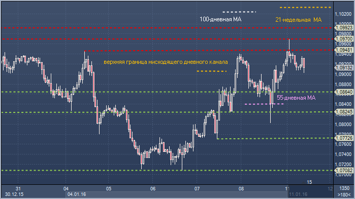 Евро/доллар. Технический взгляд Сопротивление 4: $1.1033 — 21-недельное скользящее среднее значение Сопротивление 3: $1.1024 - 100-дневное скользящее среднее значение Сопротивление 2: $1.0992 - максимум 28 и 29 декабря Сопротивление 1: $1.0970 - часовое сопротивление 11 января Цена: $1.0913 Поддержка 1: $1.0864 - часовая поддержка 8 января Поддержка 2: $1.0770 - минимум 7 января Поддержка 3: $1.0708 - минимум 6 января Поддержка 4: $1.0689 - максимум 25 ноября, в настоящее время поддержка