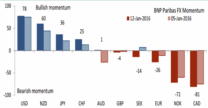 Валютные стратеги BNP Paribas обновили еженедельно публикуемую оценку текущей ситуации на валютном рынке, сгенерированную системой FX Momentum. Как следует из ее названия, система оценивает силу валютных трендов, исходя из текущей динамики валютных курсов, ставок и поведения фондового рынка. В приведенной ниже таблице указаны текущие оценки силы тренда основных валют по шкале от -100 (сильнейший медвежий моментум) до +100 (сильнейший бычий моментум).