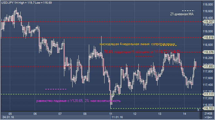 Доллар/иена. Технический взгляд Сопротивление 4: Y119.61 - 21-дневное скользящее среднее значение Сопротивление 3: Y119.28 - часовое сопротивление 5 января Сопротивление 2: Y118.81 - часовое сопротивление 6 января Сопротивление 1: Y118.38 - максимум 13 января Цена: Y117.95 Поддержка 1: Y117.18 - часовая поддержка 11 января Поддержка 2: Y116.63 - минимум 2016 от 11 января Поддержка 3: Y115.90 - месячный минимум 24 августа Поддержка 4: Y115.45 - минимум 17 ноября 2014