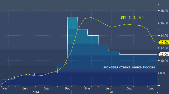 В Rabobank полагают, что Банк России возобновит цикл снижения ключевой ставки «намного позже», чем раньше ожидалось. «Это случится лишь тогда, когда нефть окончательно стабилизируется, и давление на рубль ослабеет», - говорит Петр Матыс, лондонский стратег банка. – «Возможно, Банк России снизит ставку лишь во второй половине нынешнего года. Если так и произойдет, то российские банки продолжат испытывать проблемы из-за отсутствия дешевой ликвидности, будучи отрезанными от внешних рынков». Напомним, что в последние три месяца рубль подешевел на 18% против доллара и занимает третье место в списке главных аутсайдеров среди 24 валют развивающихся стран, а также четвертое место в списке самых волатильных мировых валют. В соответствии с текущим базовым сценарием Банка России, к концу года ИПЦ опустится до 6%, а экономика сократится на 1%, если средняя цена на нефть составит $50