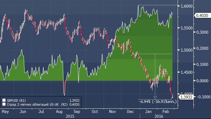 Значительную часть прошлого года фунт провел в фазе консолидации, хоть и в весьма широком диапазоне, и лишь к концу года получил повод для формирования устойчивого движения. Драйвером выступило изменение спрэдов доходности американских и британских облигаций, в частности по 5-летним бумагам он достиг уровней декабря 2014, тогда как спрэд двухлетних облигаций достиг многолетних максимумов выше 0.40%. На этих уровнях он и остается в последние пару месяцев, однако фунт/доллар и без этого сумел развить снижение — фокус сместился к теме референдума. Если сравнить динамику доходности облигаций и потери фунта, то будет видно, что инвесторы довольно сильно обеспокоены возможностью выхода Великобритании из ЕС, и это при том, что центральным сценарием для многих остается положительный для рынков итог референдума.
