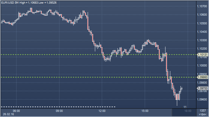 Евро/доллар продолжает достаточно устойчивое снижение, и дилеры отмечают, что с завершением торгов в Европе фиксация прибыли может притормозить этот процесс, особенно учитывая близость поддержки в районе $1.0900, попытки восстановления, вероятно, продолжат привлекать интерес к продаже. Они отмечают, что поток данных из США сегодня оказался заметно лучше прогнозов, при этом следует обратить внимание на то, что помимо резкой корректировки оценки роста ВВП США в четвертом квартале, важным событием стал пересмотр данных по потребительским расходам, которые, несмотря на сокращение оценки личных доходов были скорректированы в большую сторону.