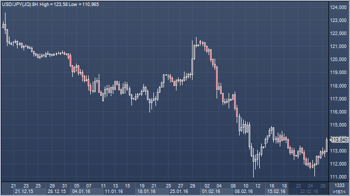 Валютные стратеги Westpac, впрочем, полагают, что, даже если американская валюта не сможет найти драйверы для роста, а нефть окажется неспособна на развитие коррекции, у быков по доллар/иене все равно есть шансы на развитие наступления. В банке считают, что рынок недооценивает обеспокоенность Банка Японией ситуацией в экономике и курсом иены, и центробанк может удивить инвесторов при объявлении итогов заседания, которое пройдет 14-15 марта. В Westpac полагают, что в отсутствие обострения на фондовых рынках доллар/иена сможет сфокусироваться на факторе денежно-кредитной политики и советуют покупать пару на спадах со стопом ниже Y110. В банке на днях опубликовали обновленные прогнозы: Westpac ждет роста доллар/иены к Y117 в этом квартале, к Y119 во втором и к Y123 к концу года.
