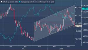 Отчет в определенной степени повлиял на ожидания ужесточения политики в США: если, судя по фьючерсам на ставку по федеральным фондам, вероятность ее повышения в марте на 0.25% оценивается менее чем в 10%, то вероятность такого события в июле возросла с 20% до 31%. Дилеры отмечают, что поступление свежих позитивных сюрпризов со стороны экономических отчетов из США может поддержать дальнейшее возрождение надежд на продолжение цикла ужесточения политики ФРС и подтолкнуть евро/доллар еще ниже. Вместе с тем, следует иметь в виду, что позитивная для медведей динамика спрэдов доходности (по 2-летним бумагам составляет 1.34%, приближаясь к максимумам декабря в районе 1.42%) базируется еще и на падении доходности по немецким бумагам - здесь сказывается рост надежд на развитие политики отрицательных ставок со стороны ЕЦБ. Медведи по евро/доллару в ближайшее время могут продолжить наступление, однако по мере приближения 10 марта (да 16 марта пройдет заседание ФРС) они, вероятно, умерят свои аппетиты