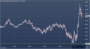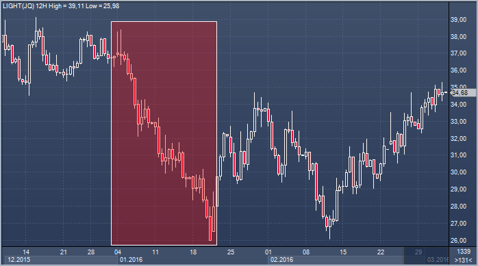 Цены на нефть колеблются в диапазоне, показывая неоднозначную реакцию на последние новости. Котировки поначалу снижались в ответ на отчет Минэнерго США, согласно которому запасы нефти в США взлетели на 10,4 миллиона баррелей, или на 2% - до 518 миллионов баррелей, исторического максимума для данного времени года. Эксперты прогнозировали рост на 3,604 миллиона баррелей. Запасы нефти на крупнейшем в стране терминале в Кушинге выросли на 1,2 миллиона баррелей — до рекордных 66,3 миллиона баррелей. Однако чуть позднее цены на нефть кардинально изменили направление и даже обновили локальные максимумы, возможно, шокировав многих трейдеров. Нефть марки WTI кратковременно поднималась выше психологической отметки в 35 долларов за баррель впервые с 6 января.
