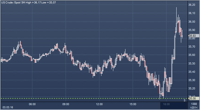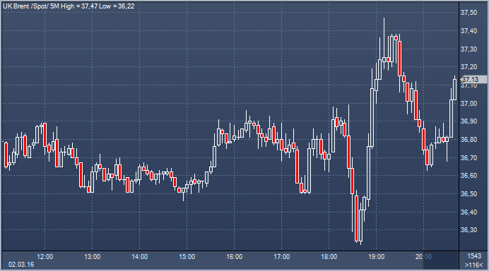 Цены на нефть снова пошли вверх после появления сообщений о скорой встречи производителей сырья с целью обсуждения ситуации на рынке для его стабилизации. Апрельские фьючерсы на сырую нефть торгуются сейчас с повышением на $0.39 на $35.12 / баррель, в районе верхней части плотного диапазона дня от $34.19 до $34.98. В среду ближайший контракт преодолел психологический рубеж в $35, впервые с начала января, достигнув пика $35.17. Сегодняшний максимум по WTI стал самым высоким уровнем с 6 января, когда сырая нефть достигла своего пика на $36.39, который сейчас является сопротивлением. Пик 2016 составляет $38.39, его мы видели 4. января. Перед этим есть еще пик 5 января на $37.10, который также будет выступать в качестве сопротивления.