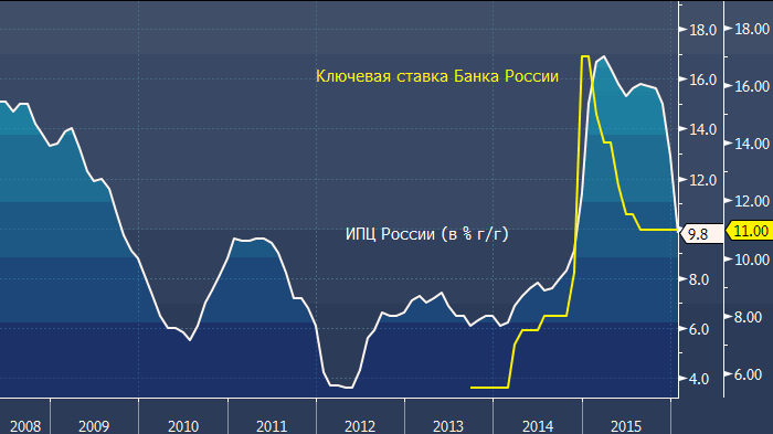 Инфляция в России снижается уже полгода и в феврале, возможно, достигла минимальных значений с октября 2014 года (прим. ProFinance.ru: об этом мы узнаем сегодня или на следующей неделе. В соответствии со средним прогнозом опрошенных Bloomberg экономистов, цифры составят 8.5% г/г), однако последствия обвала рубля в начале года могут подкорректировать этот процесс. По мнению экспертов ряда банков, Индекс цен потребителей завершит второй квартал на двузначных значениях (9.8% г/г в настоящий момент) и лишь потом начнет уверенно снижаться. «Инфляция в России снижается, но главной причиной этого является эффект высокой базы, так как в это время в прошлом году она стремительно росла», - отмечает Лиза Ермоленко из Capital Economics. – «Поэтому мы не думаем, что обнадеживающие цифры заставят ЦБ РФ изменить свое мнение и возобновить цикл снижения ключевой ставки. Наш прогноз по инфляции на конец третьего квартала составляет 11%».«Экономика России слаба, а зарплаты не растут, поэтому я с трудом вижу какое-либо инфляционное давление со стороны спроса», - говорит Виктор Жабо из Aberdeen Asset Management, который управляет портфелем облигаций развивающихся стран в $11 млрд. – «По мере стабилизации цен на нефть, а, следовательно, и рубля, снижение инфляции должно ускориться». Отметим, что в настоящий момент рынок производных инструментов учитывает в ценах снижение ключевой ставки ЦБ РФ на 0.41% в ближайшие три месяца. По оценкам исследовательского департамента Банка России, слабость рубля в декабре-январе выльется в рост инфляции на 1.3% в первом квартале, а по итогам всего года это значение составит 2.5%