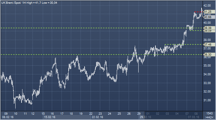 Нефть в Лондоне взлетела уже более чем на 40 %, если считать от 12-летнего минимума, достигнутого в январе, на фоне спекуляций о заморозке производства, которая будет способствовать устранению глобального перенасыщения рынка. Встреча основных производителей с целью обсудить заморозку добычи может быть проведена в России, Дохе или Вена между 20 марта и 1 апреля, заявил российский министр энергетики Александр Новак по государственному телевидению на прошлой неделе.