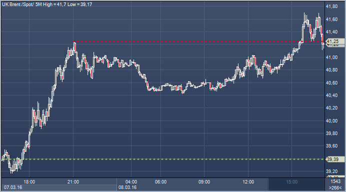 Brent с поставкой в мае прибавил 55 центов до $41.39 за баррель на лондонской ICE Futures в 12:52 дня по местному времени. Контракт поднялся на $2.12 до $40.84 в понедельник, самого высокого уровня закрытия с 4 декабря. WTI с поставкой в апреле продвинулись на 39 центов вверх до $38.29 за баррель на Нью-Йоркской товарной бирже. Контракт прибавил $1.98 до $37.90 в понедельник, самого высокого закрытия с 24 декабря . Всего объем торгов на 14 % выше среднего уровня за 100 дней.