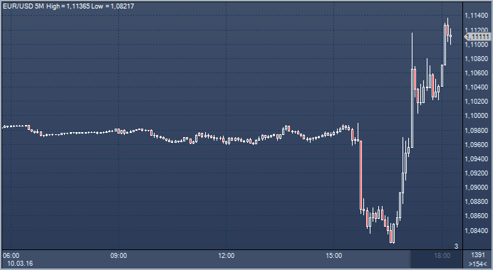 Евро летал вчера вдоволь, компенсируя недостаток движений предыдущих дней. Сначала единая европейская валюта просела до минимума в $1.0822 в реакции на новый пакет стимулирующих мер и первые слова Марио Драги на его пресс-конференции, а потом неожиданно взлетела до максимума $1.1116 в реакции на слова маэстро рынка о том, что он вроде бы не видит больше необходимости снижать ставки. В настоящее время евро после консолидации на $1.1030 снова взлетел на фигуру, до $1.1138. Поддержка находится на $1.1000, 38.2% всего движения $1.0822-1.1116. $1.0965 является 50% этого движения. Евро также терял вначале и против швейцарского франка, иены и фунта после того, как Европейский центральный банк решил подстегнуть экономику и потребительские цены снижением всех трех процентных ставок и расширением скупки активов, что стало неожиданностью для рынков. Совет управляющих Европейского центрального банка понизил базовую процентную ставку с уровня в 0,05% до нулевого показателя. Ставка по депозитам понижена до минус 0,4% с минус 0,3%, маржинальная ставка понижена до 0,25% с 0,3%.