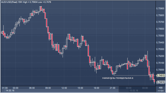 Австралийский доллар оказался под давлением после публикации протокола мартовского заседания Резервного Банка Австралии. Согласно протоколу, слабый рост заработных плат сохраняет для Центробанка потенциал сокращения процентных ставок в будущем. Это контрастирует с ожиданиями рынка, что в среду по результатам заседания FOMC, ФРС сигнализирует сохраняющуюся со своей стороны готовность продолжить цикл ужесточения монетарной политики. Дилеры отмечают, что в паре аусси/доллар ниже минимумов вчерашнего дня была расположена серия стопов, поглощение которой привело к ценам ниже фигуры 0.7500.