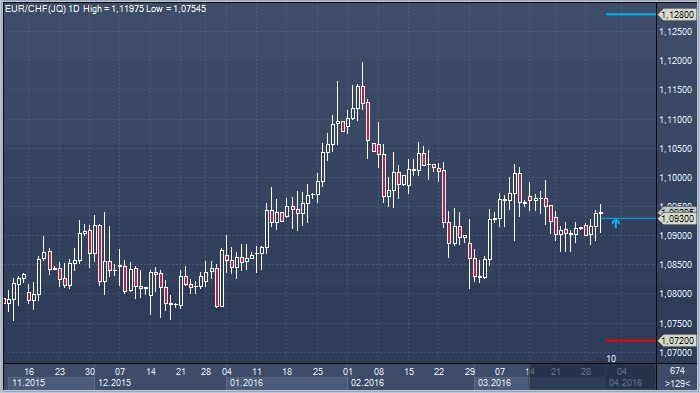 валютные стратеги Credit Agricole при цене 1.0930 рекомендовали купить евро против швейцарского франка с целью на 1.1280, ожидая, что дифференциал процентных ставок будет выступать драйвером восходящей динамики курса в ближайшие месяцы. При любом раскладе, по мнению Credit Agricole, Центробанк Швейцарии будет дольше держать ставки на рекордно низком уровне по сравнению с ЕЦБ. Защитный стоп-приказ на продажу рекомендовано установить на 1.0720. Собственный размер позиции для лонга банком был установлен на уровне 10 млн
