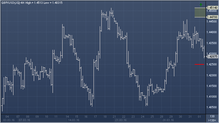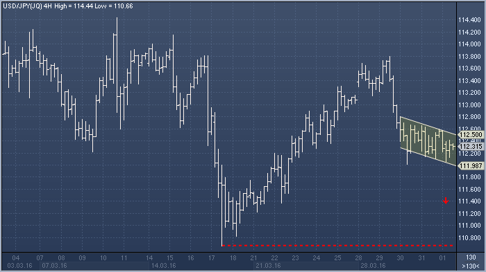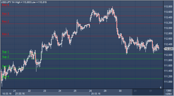 Доллар/иена. Технический взгляд Сопротивление 4: Y113.78 — максимум 29 марта, 1% - ная волатильность Сопротивление 3: Y113.45 - часовые максимумы 29 марта Сопротивление 2: Y113.16 — минимум 28 марта, теперь сопротивление Сопротивление 1: Y112.70/75 - часовое сопротивление Цена: Y112.22 Поддержка 1: Y112.04 - минимум 30 марта Поддержка 2: Y111.85 — область основания на часовом графике 22 марта Поддержка 3: Y111.42/50 — минимум 22 марта, 1%-ная волатильность Поддержка 4: Y111.08/11 — минимумы 11, 24 февраля