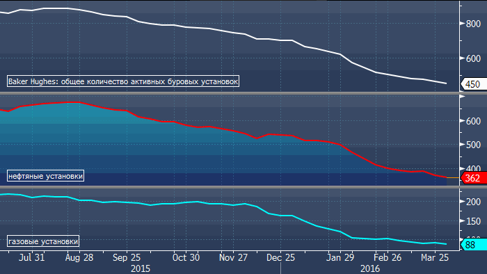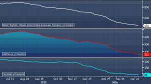 В целом по итогам сегодняшнего торгового дня нефть потеряла в цене. Напомним, что в конексте данных по буровым установкам еще пару недель назад на рынке активизировались разговоры о том, что при ценах выше 40 долларов за баррель активные нефтяные буровые установки могут начать демонстрировать увеличение.