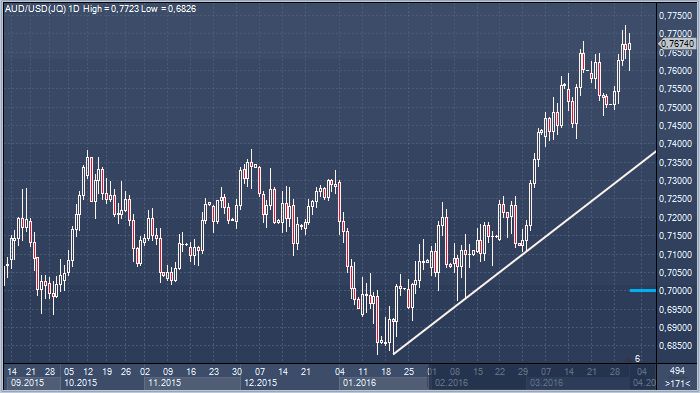 Маловероятно, что какие-либо Центробанки (за исключением ФРС) в ближайшее время станут более агрессивными в рамках своих монетарных политик. Да и склонность к риску в ближайшие недели может оказаться крайне неустойчивой. Что касается Резервного Банка Австралии, то его риторика вряд ли станет менее голубиной. В результате вышеизложенного мнения мы считаем, что австралийский доллар стоит лицом к лицу с риском нисходящей коррекции. В краткосрочном горизонте мы ожидаем возвращение курса аусси/доллар к отметке 0.7000.