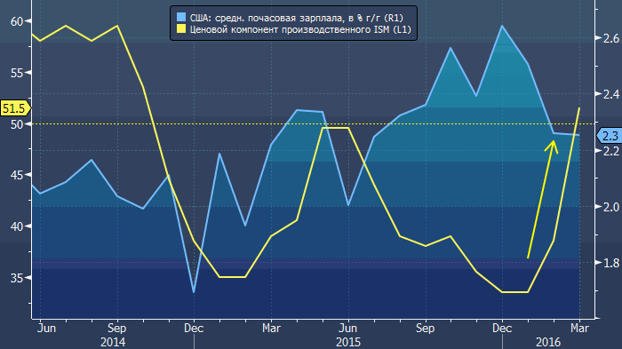 Важным моментом является ценовой компонент индекса ISM в производственной сфере. Он увеличился в марте и составил 51.5 пункта (прогноз был 44.0, а февральское значение составило 38.5 пункта). Поднявшись выше 50 пунктов, ценовой компонент стали сигнализировать об усилении ценового давления. Компонент новых заказов индекса ISM также существенно вырос и составил 58.3 пункта против 51.5 в феврале.