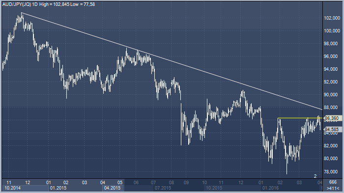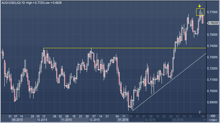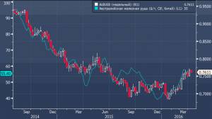 Австралийский доллар торгуется приблизительно там же, где и год назад, когда РБА удивил участников рынка неожиданным снижением ставки, на что его, в частности, подтолкнул рост курса национальной валюты. Впрочем, тогда ситуация была несколько иной: цены на железную руду за предшествующий месяц потеряли около 10%, а данные из Китая настраивали на мрачный лад. Теперь же рост аусси оказался подкреплен ралли цен на железную руду на фоне общего улучшения атмосферы на сырьевых рынках, а также более сильными данными по ВВП Австралии за четвертый квартал и стабилизацией показателей китайской статистики. Если что-то и должно беспокоить РБА, то это даже не последние показатели розничных продаж, а снижение инфляционных ожиданий. Это вполне может оправдать мягкую тональность риторики руководства центробанка, но также не дает повода ожидать фактического смягчения политики. Мы полагаем, что политическая неопределенность — принятие бюджета было отложено на 3 мая, а ранние выборы могут пройти уже 2 июля — также является фактором, который удержит РБА от снижения ставок в ближайшее время.
