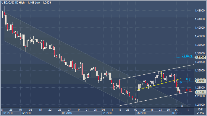 В тот же день (6 июня), но ближе к вечеру, Deutsche Bank сообщил, что открыл в паре доллар/канада покупку от 1.2950 с целью на 1.3500 и стопом на 1.2700. В данный момент эта позиция закрыта по стопу с убытком 250 пунктов.