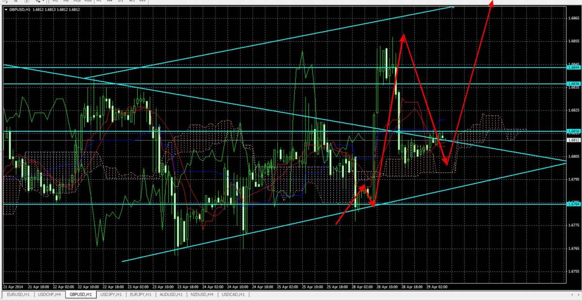 как вчера и говорилось,фунт вышел из фигуры (3-я волна),затем вернулся(4-я волна)и сегодня продолжает отрабатывать фигуру (5-я волна)тп 6875 с учетом спрэда (2-й индеец),дальнейшее движение фунта на подъем ограничено трендовой от фигуры