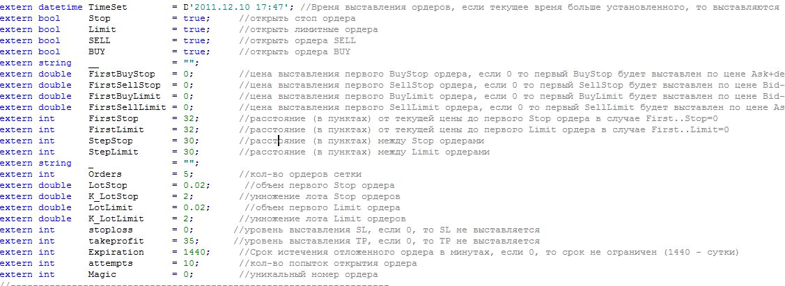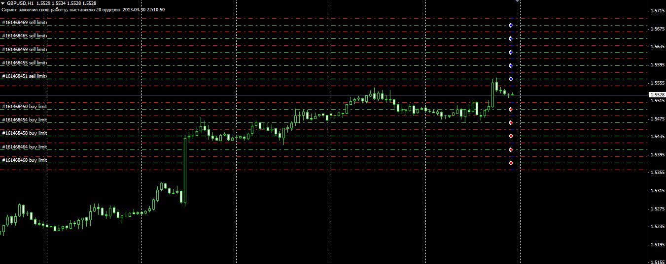т.е. если ты входишь по рынку 0.1 лотом то и бай/селл стопы у тебя должны быть 0.1 лота, а серия лимитников начинаться со стартовым лотом 0.2 и коэффициентом 2. соответственно и шаг везде должен быть одинаковый как и тейк.