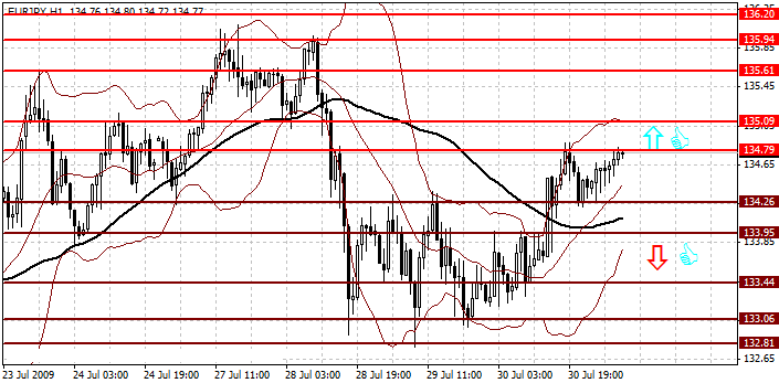 Я рекомендую открывать длинные позиции после пробоя по итогам часа сопротивления на уровне 134.79, с целью повышения к сопротивлению на уровне 135.09 и в случае его пробоя по итогам часа к 135.44. Стоплосс при данной стратегии можно разместить на уровне 134.19.